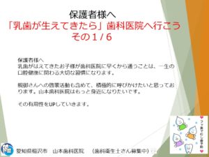 保護者様へ 「乳歯が生えて来たら」歯科医院へ行こう1/6 2025.07.08 院長ブログ 愛知県稲沢市 山本歯科医院の山本です。 歯科情報のブログとして お子さまの乳歯が生えてきたらどうしたらいいかお伝えします。 一覧へ戻る